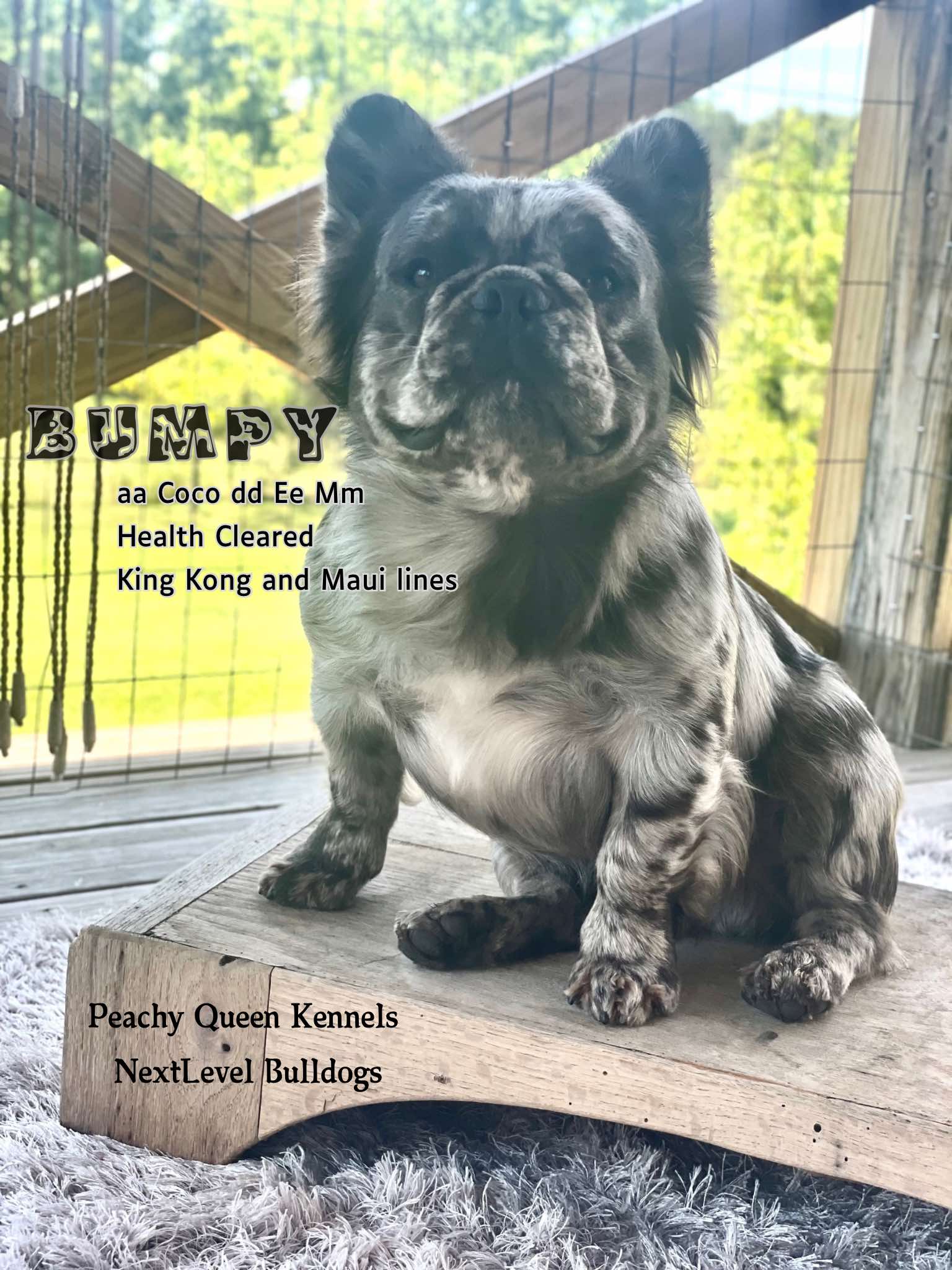 Mustard – stud fee $2,500.00 cocoa merle fluffy carries testable chocolate, blue, and 2x low shedding